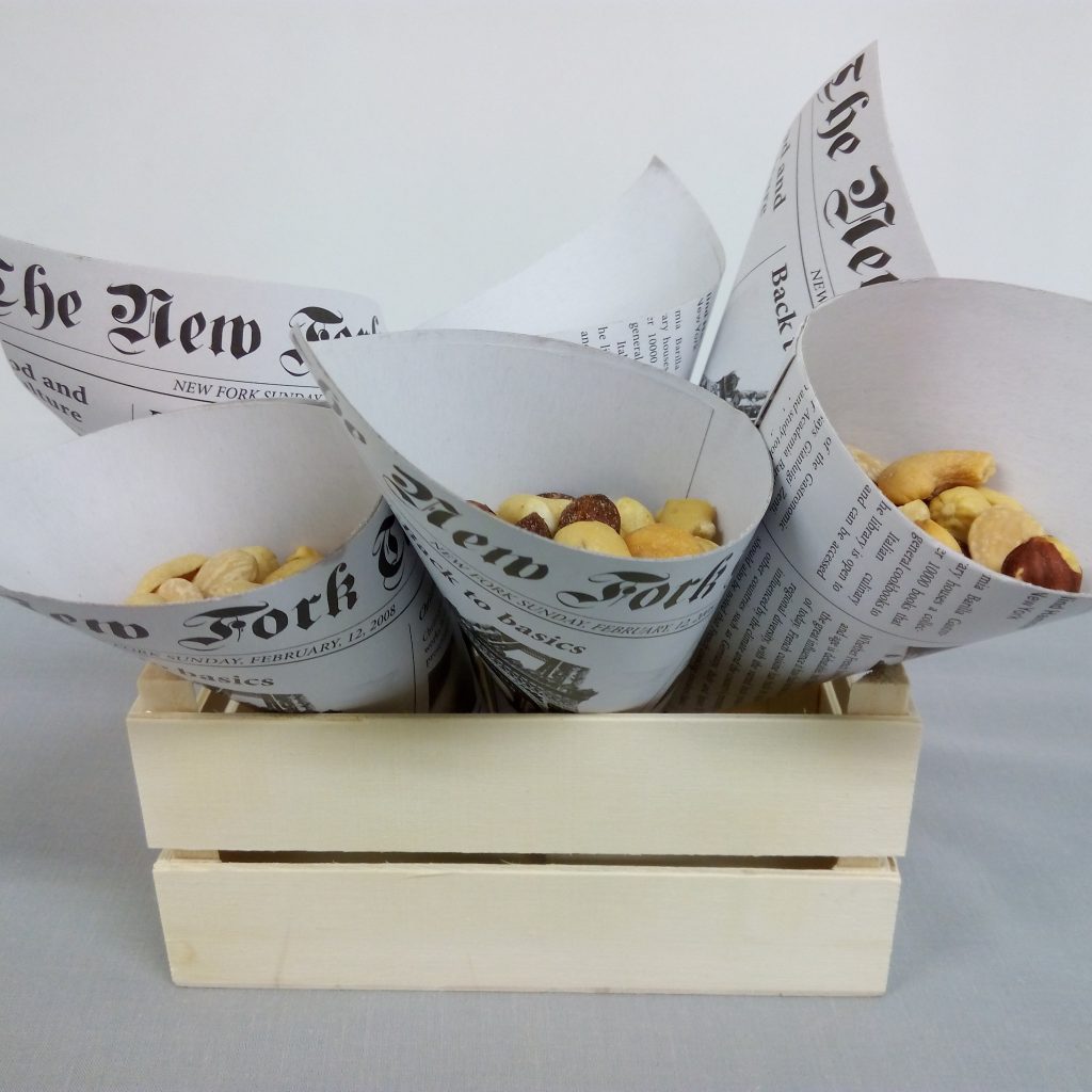 Un ejemplo es el de la foto. Son frutos secos metidos en cucuruchos que imitan a papel de periódico, dentro de una mini caja de fruta.