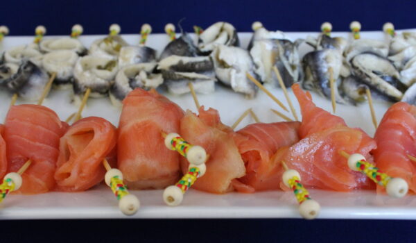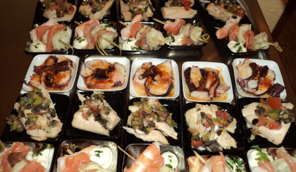 1.Pulpo a la gallega. 2.Atún con vinagreta. 3.Brocheta de langostino cocido y pelado, lenguado a