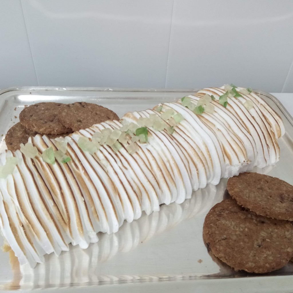 Mezclar en un cazo las claras y el azúcar y calentarlo suavemente hasta que las claras pierden viscosidad (unos 50º C). En este momento se ponen a batir a punto de nieve hasta que estén firmes y brillantes. - Poner una capa gruesa de merengue sobre el brazo que hemos cubierto de crema de limón, hacer estrías imitando a la madera y gratinar. Puede adornarse con guindas o frutas escarchadas.