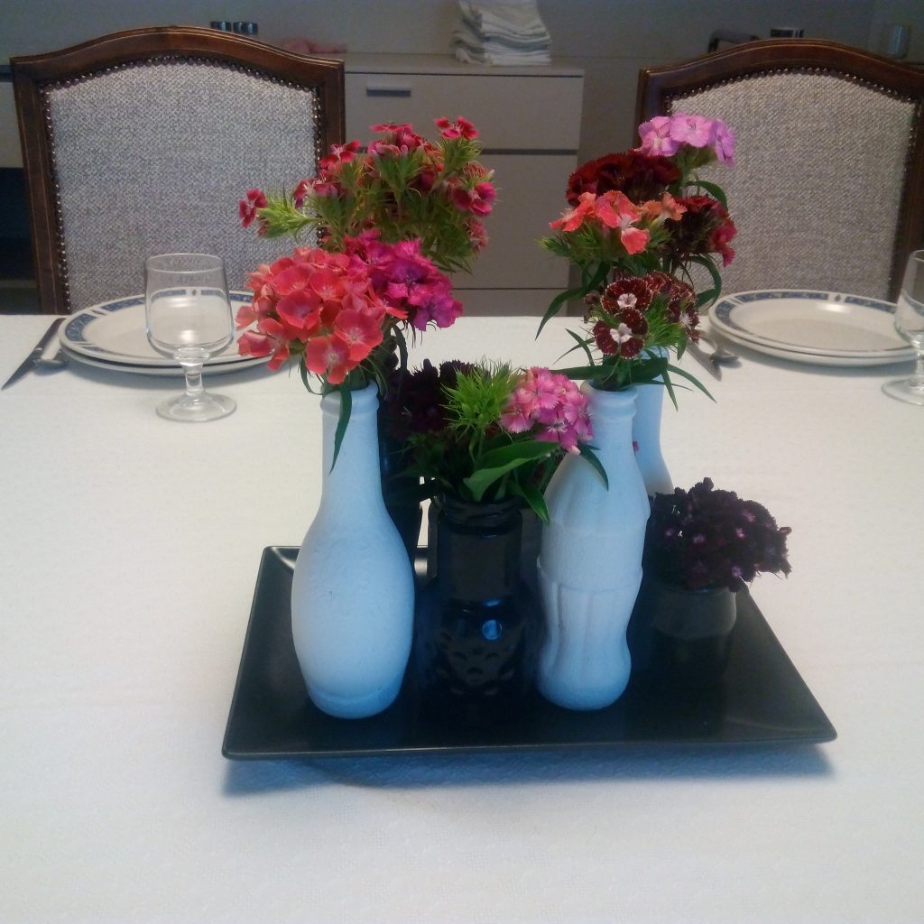 Las botellas de la foto son de coca-cola, tónica, yogur… Las he pintado con pintura negra para pizarra y pintura blanca tipo tiza.