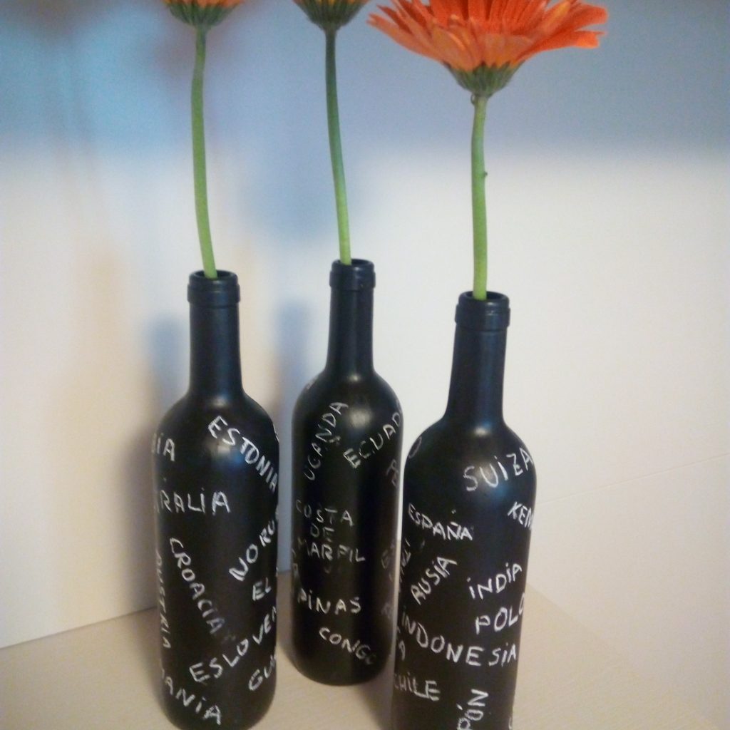 Lo primero es quitar las etiquetas a las botellas. Yo las meto en el lavavajillas para ablandarlas y luego quito los restos de papel con un rascavidrios. Después hay que dar varias capas de pintura. La primera cuesta un poco porque patina, pero es cuestión de dar varias capas, dejando tiempo para que se seque entre capa y capa. Yo las pinté con brocha y la última capa con rodillo para que quedara más liso. Y después es cuestión de imaginación. En este caso he escrito con tiza nombres de países. Pero también se puede poner ¡Feliz Navidad! en distintos idiomas, los nombres de los miembros de la familia…