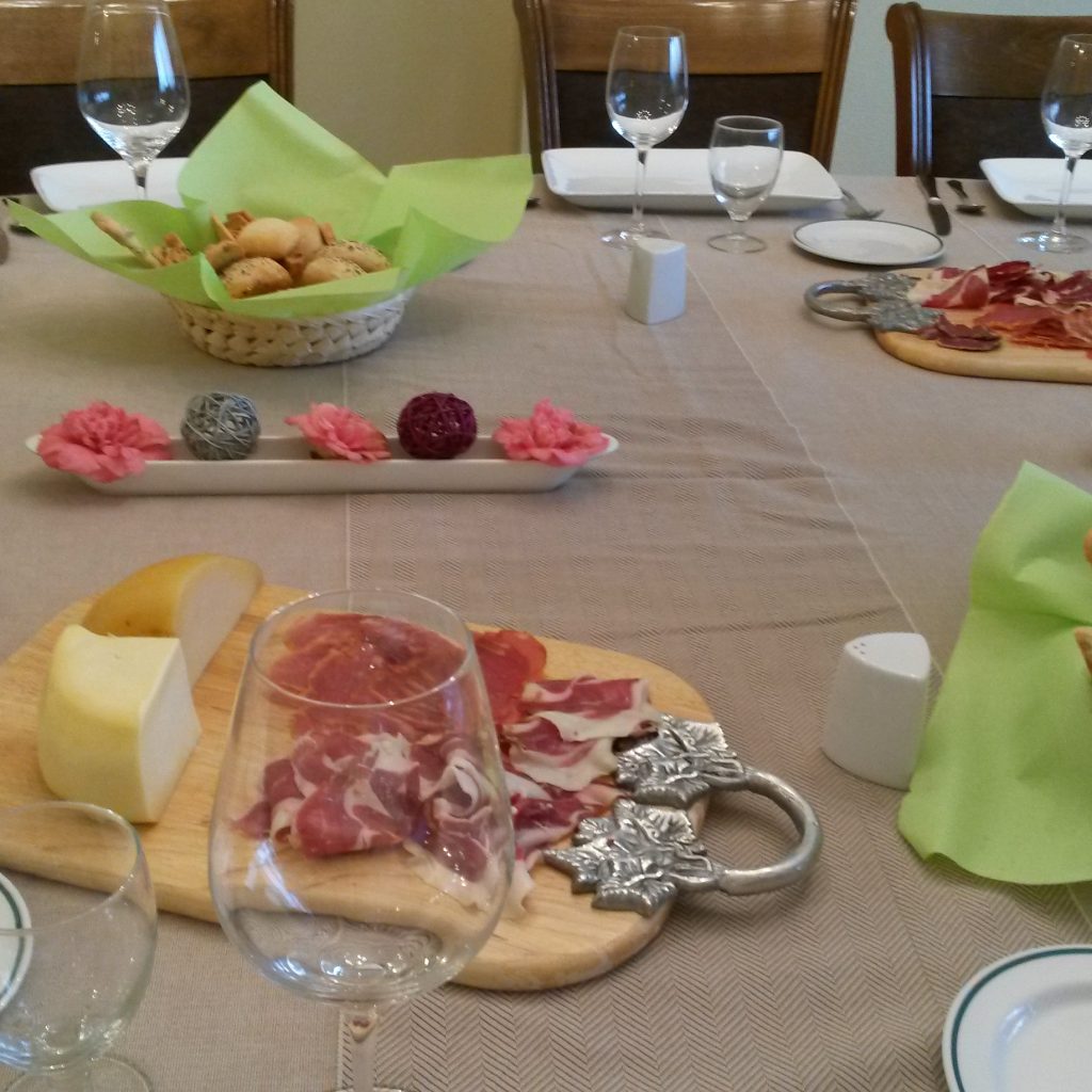 En este caso la comida tenía mucho protagonismo y decoraba por sí misma. Así que puse esta pequeña fuente en forma de barca con unas camelias y unas bolas de mimbre.