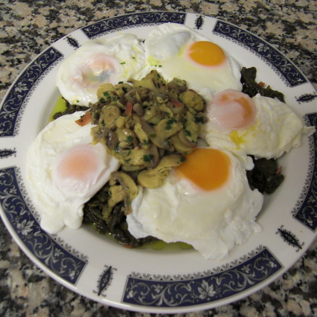 En una fuente redonda cubrir el fondo con las espinacas. Colocar los huevos encima en redondo y en el centro poner los champiñones