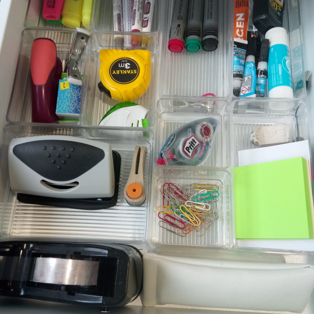 Me encanta el material de papelería. Y por eso creo que tenía demasiado. Así que he comprado cajas transparentes en un bazar y he hecho un cambio de cajones. He retirado lo que no uso y lo que está demás y lo voy a donar.