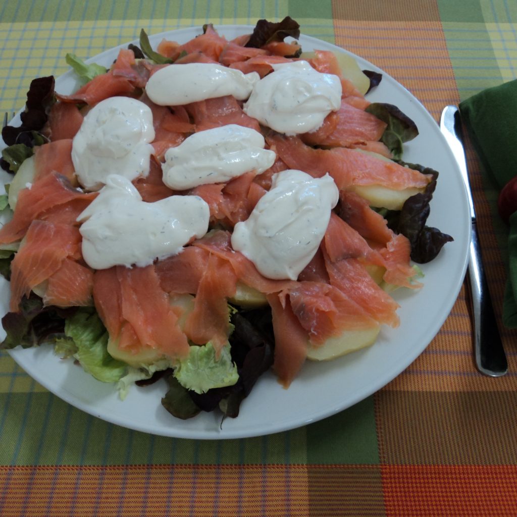 - Mezclar las patatas con la manzana y el salmón, y envolver bien con la salsa.