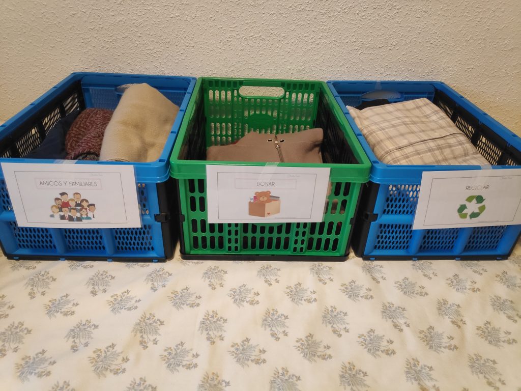En este caso empezamos por su ropa. Sacamos todo y repartimos en cuatro lotes: