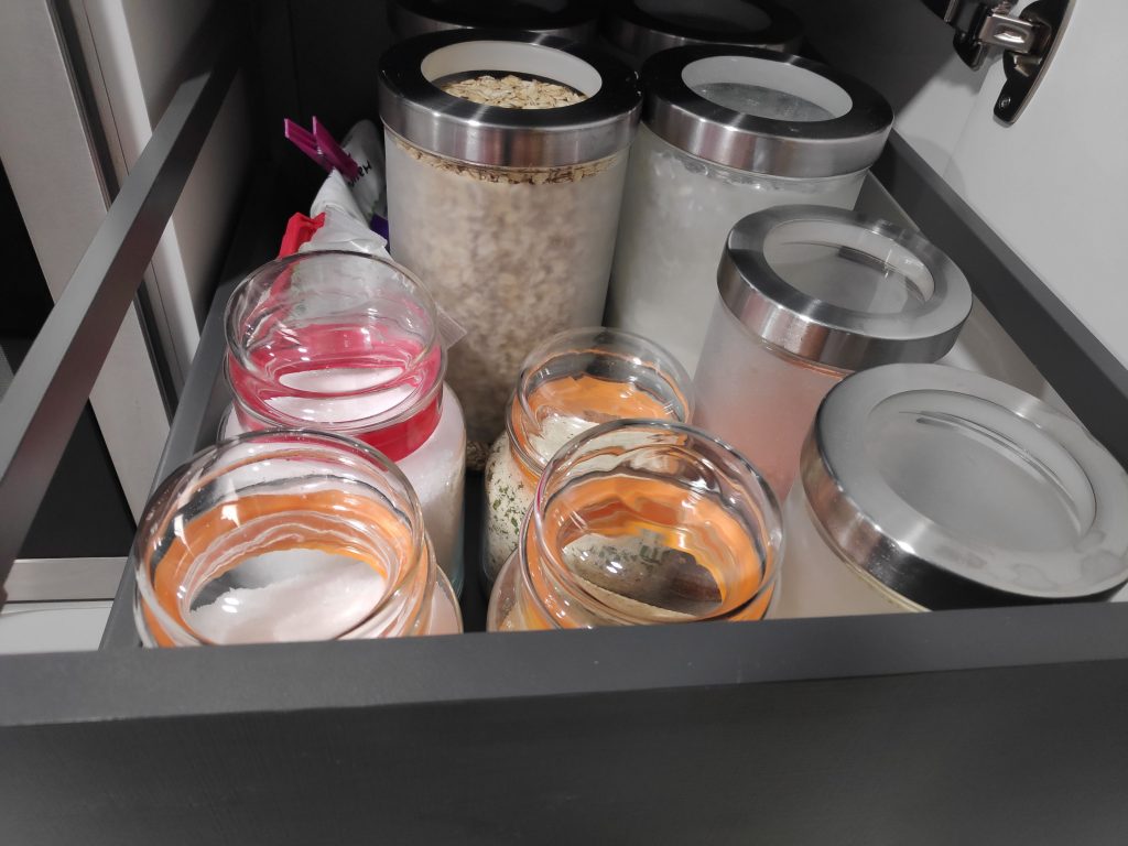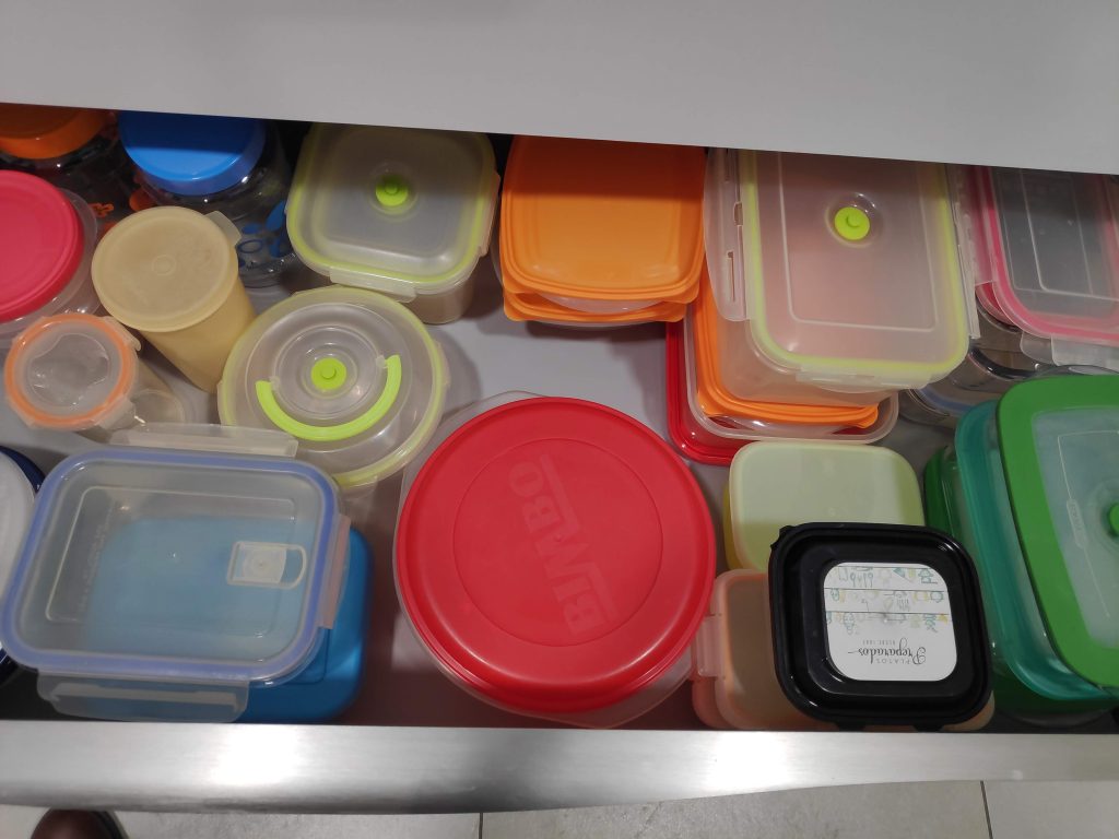 A mí me gusta poner cada tapa debajo de su “dueño”, para que no cojan mal olor y se encuentre fácilmente. Pero como en este caso los tenía bien emparejados, pero con la tapa encima, se los dejé así.