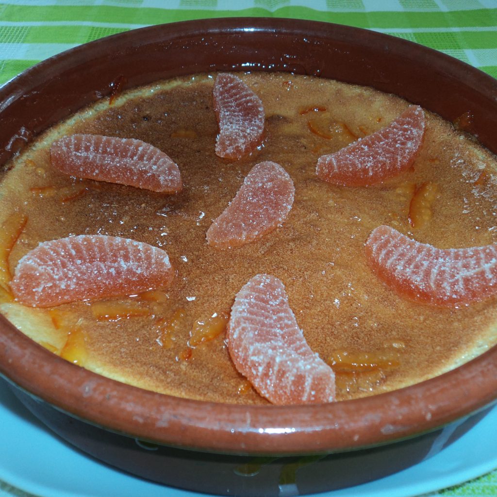 4.Cubrir el soufflé con mermelada de naranja y decorar con gominolas de gajos de mandarina.