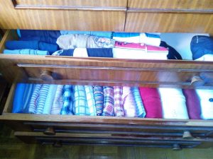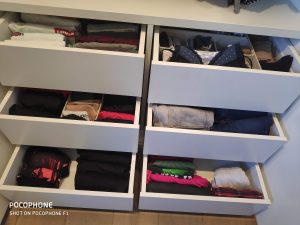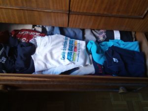 En esta segunda sesión, lo primero que hicimos fue enseñar a los niños a doblar sus calcetines y sus camisetas en vertical al estilo Marie Kondo. Algunos habían traído su propia ropa para doblar.